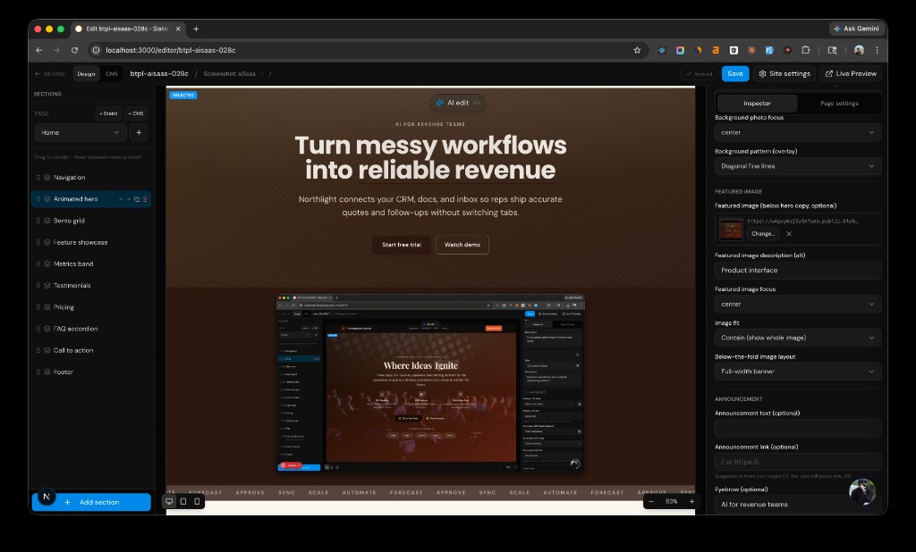 The canvas and Inspector let you tune real sections—here an Animated hero—with controls for background, imagery, layout, and copy.