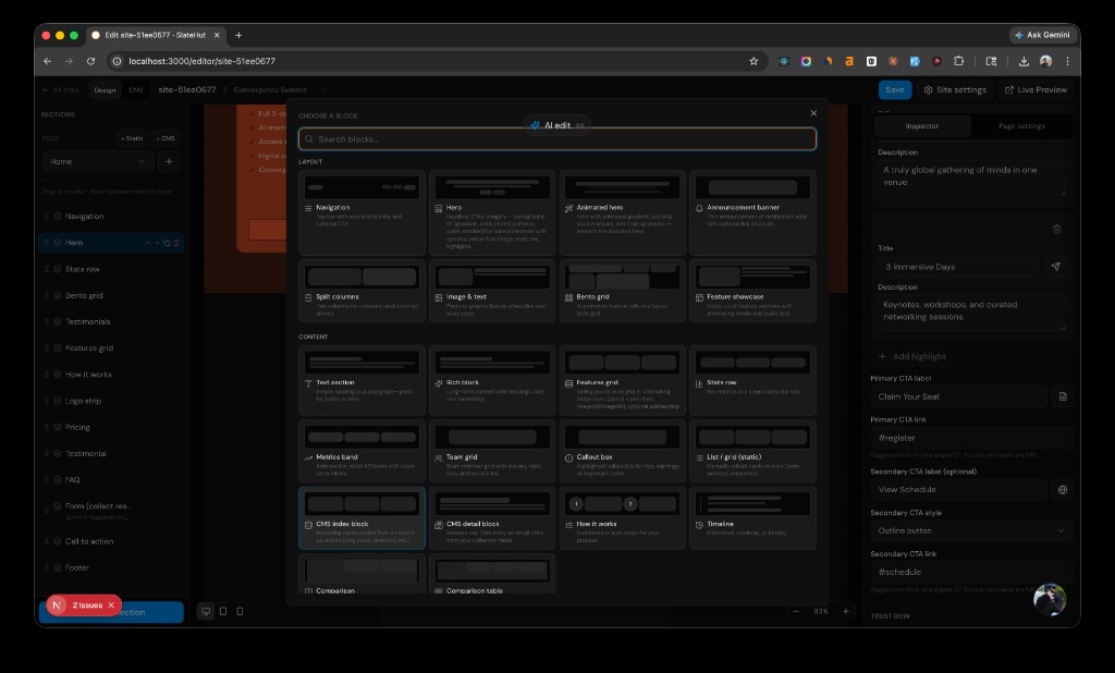 What makes it different: many builders leave you at a blank template. SlateHut leads with a generated draft so structure and placeholder copy feel intentional from the first minute. The design system stays minimal and adaptable across industries, and the product avoids turning into an oversized general-purpose CMS when speed is the goal.