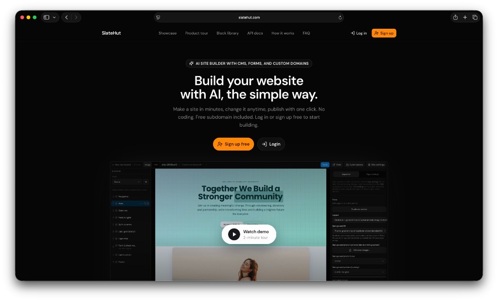 SlateHut builds your website for you. You describe your business in plain English, and SlateHut’s AI produces a complete, live site with multiple pages: hero sections, contact forms, pricing tables, and more. You edit visually with no code, connect a custom domain, and manage form submissions from one dashboard. Developers and agencies can automate workflows through a full REST API and Model Context Protocol (MCP) support—useful if you want assistants like Claude or ChatGPT to create or update sites on your behalf.
